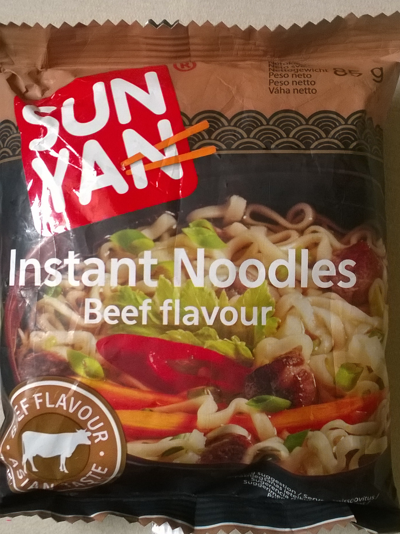 S nadšením jsem sledoval chutně se tvářící prášek koření rozpouštět v talíři nudlemi poseté vody o vysoké teplotě. Má polévka nevoněla nikterak výrazně, dost jasno o průběhu svého nadcházejícího gastronomického zážitku jsem ovšem měl už po první ochutnané lžíci. Chuťový profil této polévky je tvořen tlustou vrstvou glutamátové chuti na slaném podkladu s celkem horkotěžko pochytitelným výrazem koření klasické čínské polívky z pytlíku, kterou jste milovali v dětství, když její chuť byla tou zapovězenou, nezdravou stravou pro upocené dělníky, osamělé noční hlídače, roztomilé, ale spěchající akvabely před úmorným vystoupením ve světle, které se ve vodě láme tak zákeřně, že někdy vůbec není lehké trefit objekt na dosah ruky. Dále bych rád připsal, tahle polívka je trochu pikantní, pepřově a škrábavě, ne však otravně příliš. Nudle, ty kudrnaté záchranné kruhy hmoty v nekonečně dělitelné kapalině dnešního zaháněče utrpení, utrpení ve formě hladu, nebyly pro mě při střetku žádným zklamáním. Zakousnutí do nich vyústilo v sofistikovanou synergii splynutí chutí. Nudle, spíše tukového ražení, s kapalným zbytkem polívky o chuti jakéhosi jakože masového vývaru. Vesele jsem si synergii vychutnával až do poslední lžičky – polívku jsem tedy nevylil, při jejím jezení jsem ani přehnaně netrpěl. Nestydím se říct; konzumací "Sun Yan hovězí" jsem nezískal nic zanedbatelnějšího, než je sice krátkodobé, ale jinak velice robustní zasycení. Tato polévka dostává sedm z deseti!