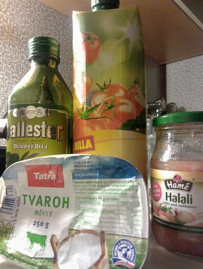 Jako zeleninu jsem zvolil „směs pod svíčkovou“ halali. Uvědomuju si, co si někteří lidé myslí o rajčatovém džusu. Nicméně, pokud zvládáte protlak, pravděpodobně žaludek udrží i džus. Poznámka: přiložený obrázek je ilustrační a nemá ve čtenáři vyvolat dojem, že tvaroh Tatra je dobrý tvaroh!